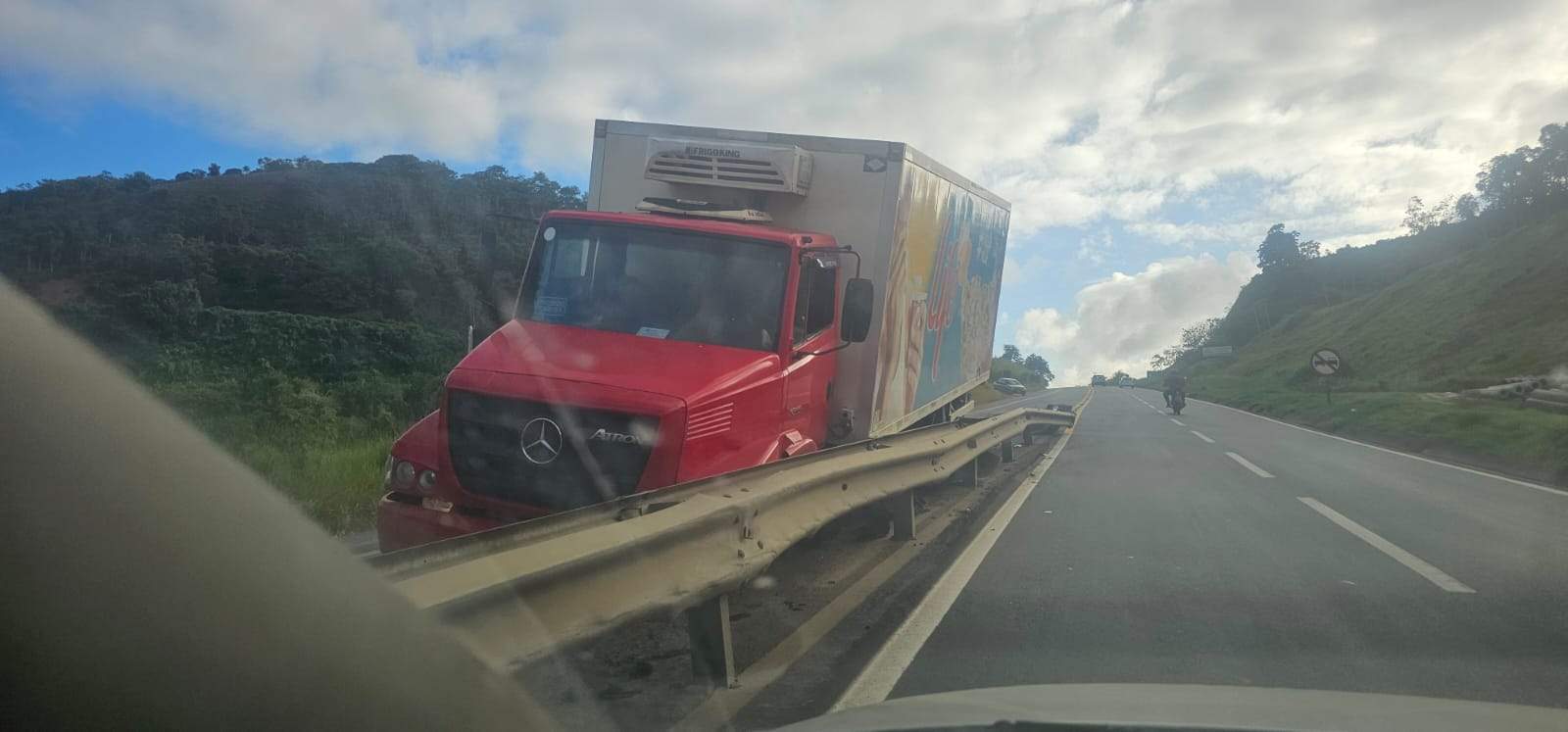 MANHUAÇU (MG) – Um caminhão colidiu com a defensa metálica que divide as pistas da BR-262 na manhã desta sexta-feira (16), no km 33, nas proximidades da entrada do Residencial Clube do Sol, em Manhuaçu. Conforme apurado pelo Portal Caparáo, o acidente aconteceu por volta das 6h e interditou parcialmente a pista no sentido Vitória–Belo Horizonte.